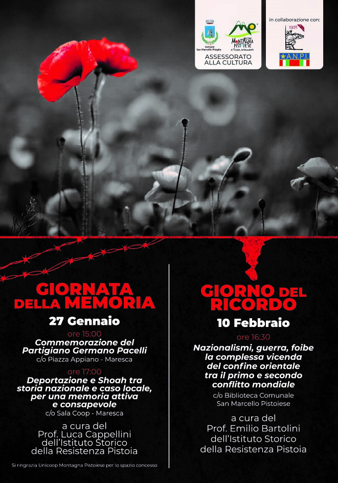 In occasione della Giornata della Memoria (27 gennaio) e del Giorno del Ricordo (10 febbraio) l'Assessorato alla Cultura propone due incontri di approfondimento in collaborazione con ANPI Montagna Pistoiese e con Istituto Storico della Resistenza di Pistoia.