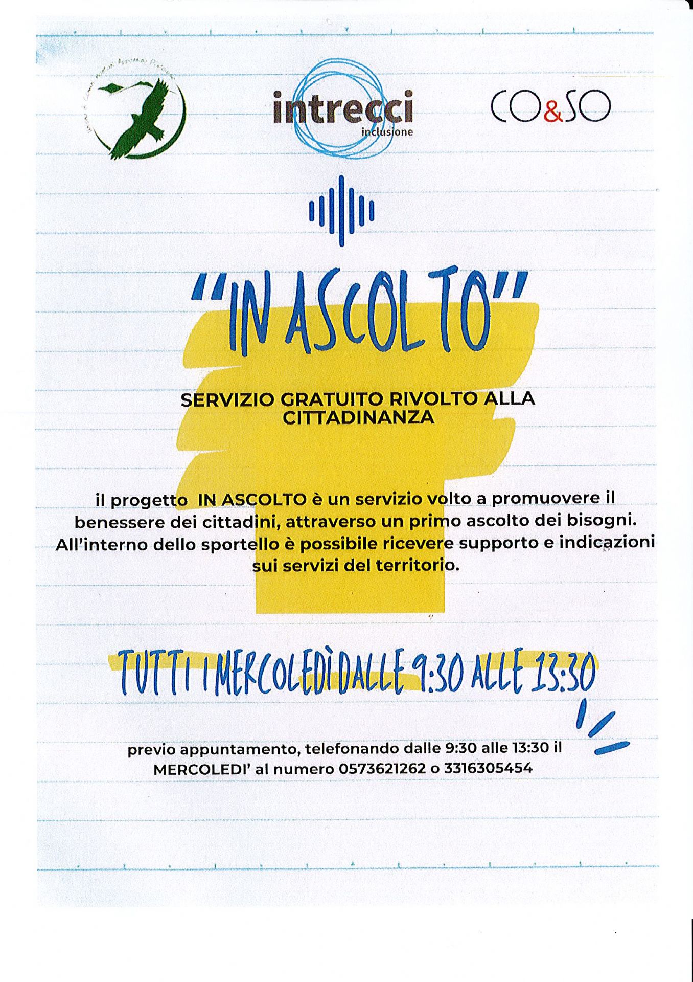 Il progetto "IN ASCOLTO" nasce nel 2021come servizio volto a promuovere la prevenzione e la tutela del benessere dei cittadini, attraverso la messa a disposizione di uno spazio riservato e neutro all'interno del quale è possibile chiedere e ricevere un supporto in momenti difficili. Un operatore specializzato sarà disponibile per ascoltare, dare consigli, aiutare ad affrontare con visione positiva i problemi quotidiani.