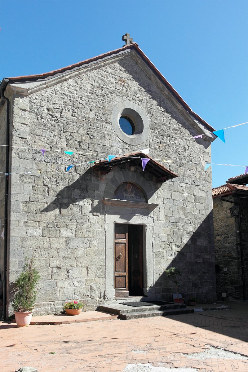 L'impianto della chiesa è a navata unica, coperta da capriate lignee, terminante con abside trapezoidale. Sulla parete sinistra si apre una piccola cappella, intorno le cui pareti, non intonacate, mostrano la muratura in conci di pietra regolari disposti a filaretto. All'esterno presenta una facciata a capanna di tipo romanico in conci di pietra regolari disposti a filaretto su cui si apre il portale in pietra, sormontato da una lunetta e, in asse con questo troviamo, sopra la piccola tettoia che ripara l'ingresso, un'apertura circolare. la La data 1201, incisa su di un concio sul fianco destro presso lo spigolo di facciata, può essere forse indicativa dell'Anno di fondazione