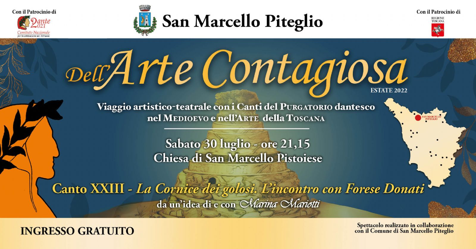 Dopo il viaggio nell'Inferno dantesco del 2021, SABATO 30 LUGLIO 2022 alle ore 21.15 nella Chiesa di San Marcello Pistoiese, Marina Mariotti ci accompagnerà nella Cornice dei Golosi del Purgatorio, illustrando e leggendo il XXIII canto.