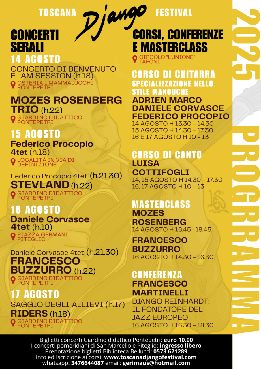 Vi aspetta un ricco programma di concerti, corsi, masterclass e una conferenza dedicata alla storia di Django Reinhardt con il Professor Francesco Martinelli, tra i maggiori esperti internazionali di storia della musica.