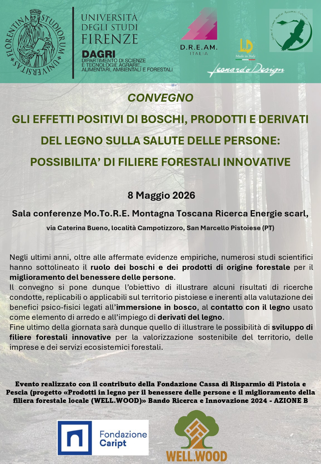 Convegno: GLI EFFETTI POSITIVI DI BOSCHI, PRODOTTI E DERIVATI DEL LEGNO SULLA SALUTE DELLE PERSONE: POSSIBILITA’ DI FILIERE FORESTALI INNOVATIVE - Venerdì 8 maggio 2026 ore 9.30 Sala Conferenze Mo.To.R.E. via Caterina Bueno, Campotizzoro San Marcello Piteglio (PT)