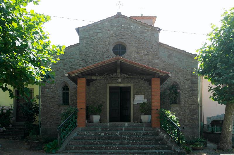 La chiesa, di piccole dimensioni, si presenta con un impianto a tre navate, separate da colonne a base quadrata che sorreggono archi a tutto sesto e termina con un abside quadrangolare. La navata centrale ha copertura lignea a capanna, mentre quelle laterali sono coperti da spioventi lignei. La facciata, in pietra faccia vista, è preceduta da una scalinata in pietra, in quanto la pavimentazione della chiesa è a una quota superiore rispetto a quella della strada. Sulla facciata è addossato un portichetto, sorretto da due colonne in laterizio, con copertura lignea a due spioventi. In corrispondenza delle navate laterali, identificate dai due spioventi, più bassi rispetto alla copertura a capanna, si aprono due monofore, mentre in asse con il portale d'ingresso si apre un oculo.